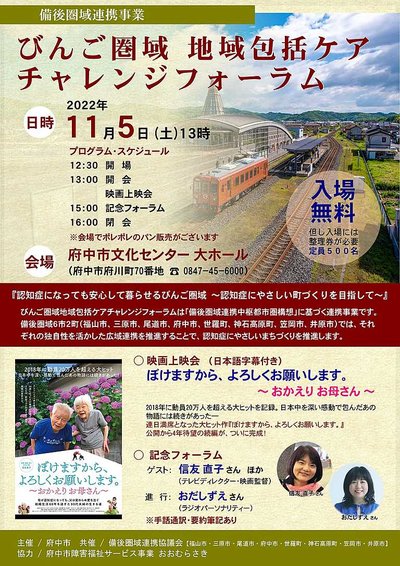 広島県府中市(府中市文化センター)で開催する「びんご圏域地域包括ケアチャレンジフォーラム」の会場で、当日上映する映画「ぼけますから、よろしくお願いします。~おかえりお母さん~」の映画パンフレットや関連書籍の販売をします。