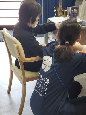 天色の湯では、全体でのレクリエーションは行わずに、ご利用者様自身で過ごし方を選択いただく【選択型アクティビティ】を提供しています。 脳トレやパズル、編み物、書道、創作活動、オセロなどのゲームやお茶を飲みながらのおしゃべりなどなど、スタッフと一緒にお風呂上がりのひと時を自由にお過ごしいただけます。