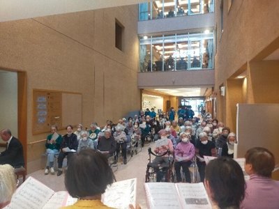 デイサービスではフロア担当の職員さんが少ない中、歌詞の張り替え、指差し、カメラ調整などのフォローをしていただきありがとうございました。特養3階では手持ち歌詞集を使用しましたが、職員さんがめくりを手伝って下さったりしてありがたかったです。