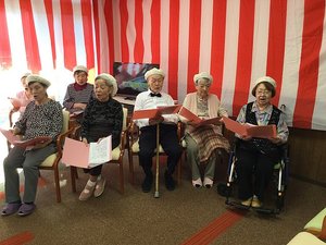 利用者様がすでにお待ちになられており、準備を整え、懐かしい曲を中心に演奏させていただきました。 スタッフの皆さんにも非常に盛り上げていただき、利用者様もとても歌の好きな方々ばかりでスタッフさんが気を利かせて、歌詞カードを皆さんに配っていただいたことで皆さんで声を出して参加型のレクリエーションとなりました。ありがとうございます。