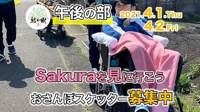 スケッターは初めてで緊張していましたが、職員の方達がとても優しく穏やかな雰囲気で利用者の方達と過ごさせて頂く事が出来ました。 お花見に一緒に行かせて頂きましたが、その間も優しく利用者様に話しかけられていて和気あいあいとした雰囲気でした! とても楽しく、皆さんとご一緒させて頂きました。 また機会がありましたら、よろしくお願い致します(^^)