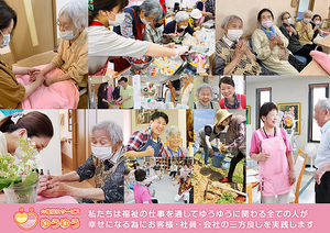 お客様に「ありがとう」や「楽しかったよ」「また来るね」と笑顔で言われるたびに、自分の仕事にやりがいを感じています。だからこそ、一人でも多くの方に笑顔になっていただく為に、お一人お一人に合わせた声掛けや支援を常に心掛けています。また、支えておられるご家族の笑顔も大切にしたいと考えています。 理念 私達は介護の仕事を通じてゆうゆうに関わる全ての人が幸せになるためにお客様・社員・会社の三方良しを実践します 行動指針 一、お客様に喜ばれる行動をします 一、物心共に豊かな社員を目指します 一、時代の流れに適応したサービスを提供します