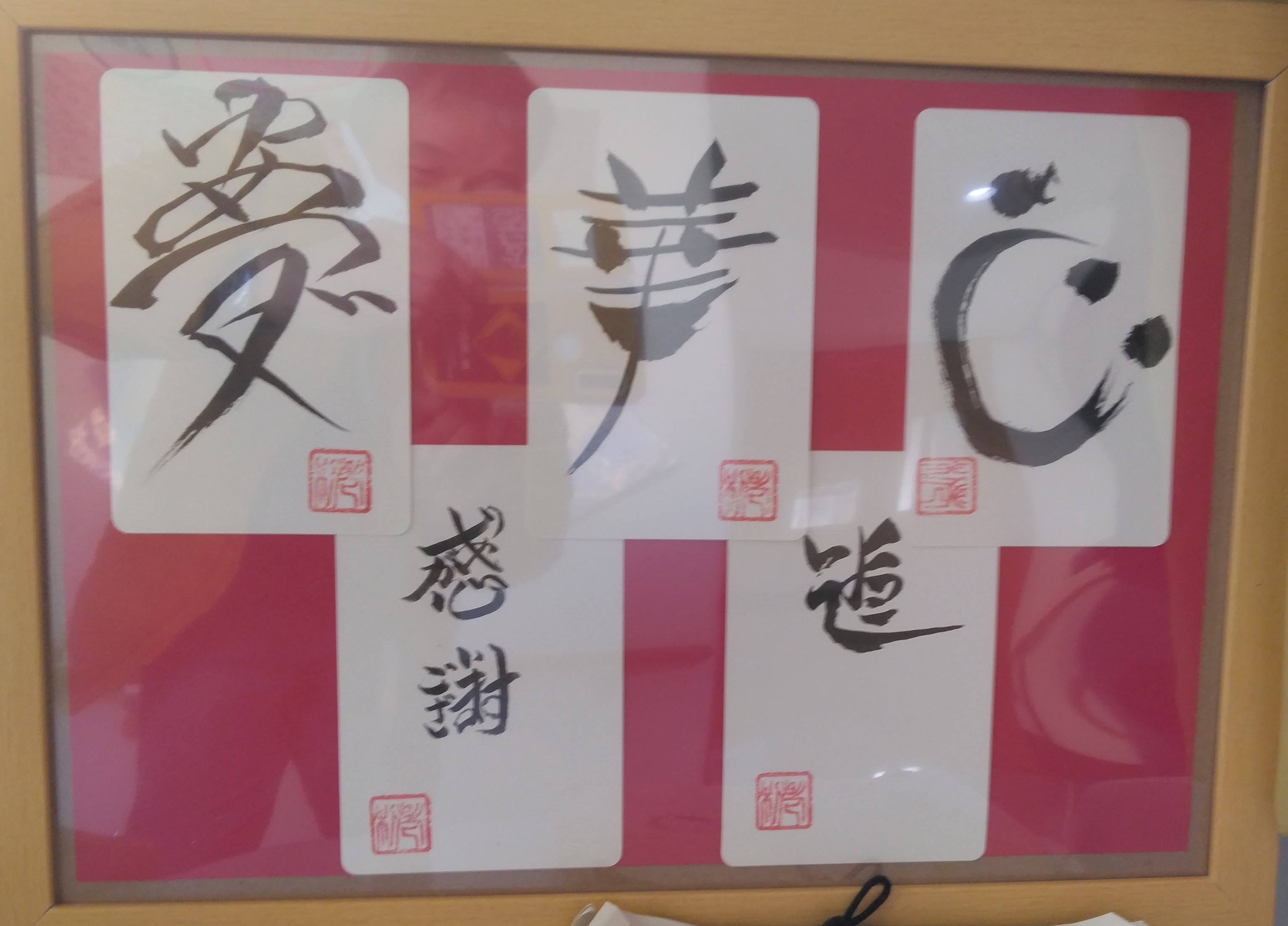 お楽しみ寄席の第一部、書道演芸はただ単に文字を書いて見せるのではなく、お客様とのおしゃべりを大切に心がけています。書いている途中で筆を止めて、何の文字か聞いてみたり、早くも当ててくださったお客様を称賛したりと、テンポよく、かつ心地よいコミュニケ―ションができればベストです。落語は台本が命です。内容は人情噺ですが、日ごろから心動かされるネタを拾って、メモするようにしています。台本書きはドラマの構成を考えてエンタメの脚本のように組み立てています。この技術(私なりの方法論)はいずれ、個人のnoteにアップする予定です(➡今後の体験レポで告知します)。写真は前回の書道演芸で施設に寄付した葉書大の作品です。施設長が額装してくださいました。