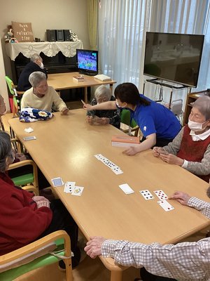 通所、入居の方約20名程の利用者様と約10曲ほどご一緒しました。三拍子の曲に乗せ歌いながら、ウン・パン・パンとリズム楽器を鳴らしてくださいました。スタッフさんが「○さん、すごくお上手です!」声をかけられた男性は当初表情が堅かったのですが、笑顔満開!その他手遊びも取り入れお口と手を同時に使って 私も楽器を置いて一緒に歌わせて頂きました。
