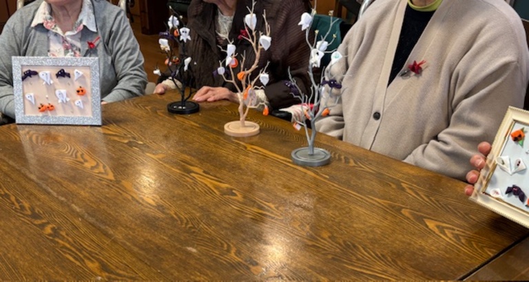 10月の物づくりのお手伝いをさせていただきました。 季節ものでハロウィンの飾り物製作をしました。 先月、参加者さんからワイヤーを使った飾りを作りたいとの要望がありましたので吊るして飾るもの、額縁で飾るもののどちらかを選択していただきました。