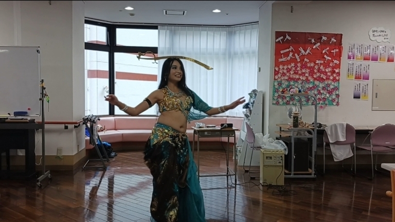 ショーが始まる前から、ご利用者様が楽しみにしていますと暖かくお声がけくださったり、ショーの間もすごくにこやかにご覧くださったおかげで、とても楽しくベリーダンスをお届けさせて頂くことができました。 また、ショーの後、片面太鼓を使ったリズム遊びもさせて頂きましたが、皆さん暖かく手拍子くださり、よかったです。 レクリエーションの後、「すごく素晴らしかったです!」と暖かくお声がけくださるご利用者様や、感極まって涙を流されるご利用者様がいらしたのがすごく印象的で、皆様にとっても心に残るベリーダンスでのレクリエーションができたと実感でき、大変うれしかったです。 スタッフ様より、上の階に入所されている方々のレクリエーションにもぜひ来てもらいたい、というお言葉も頂くことができ、今度は上の階のフロアの方々にもベリーダンスをお届けしたいと思います。