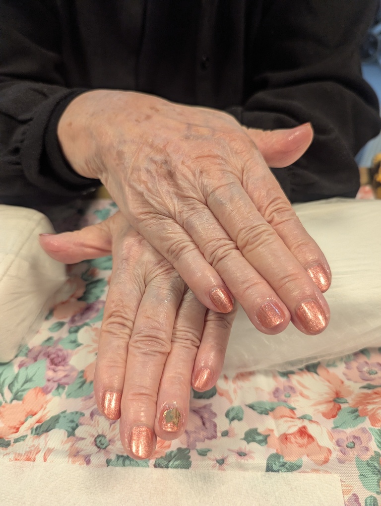 デイサービスのご利用者様9名にマニキュアをさせていただきました。ネイル用のスペースも準備していただき、順番も段取りしてくださいました。順番待ちの方も、待ち時間の間に色選びでワイワイとして、まるで女子会のような楽しいひと時を過ごしました。