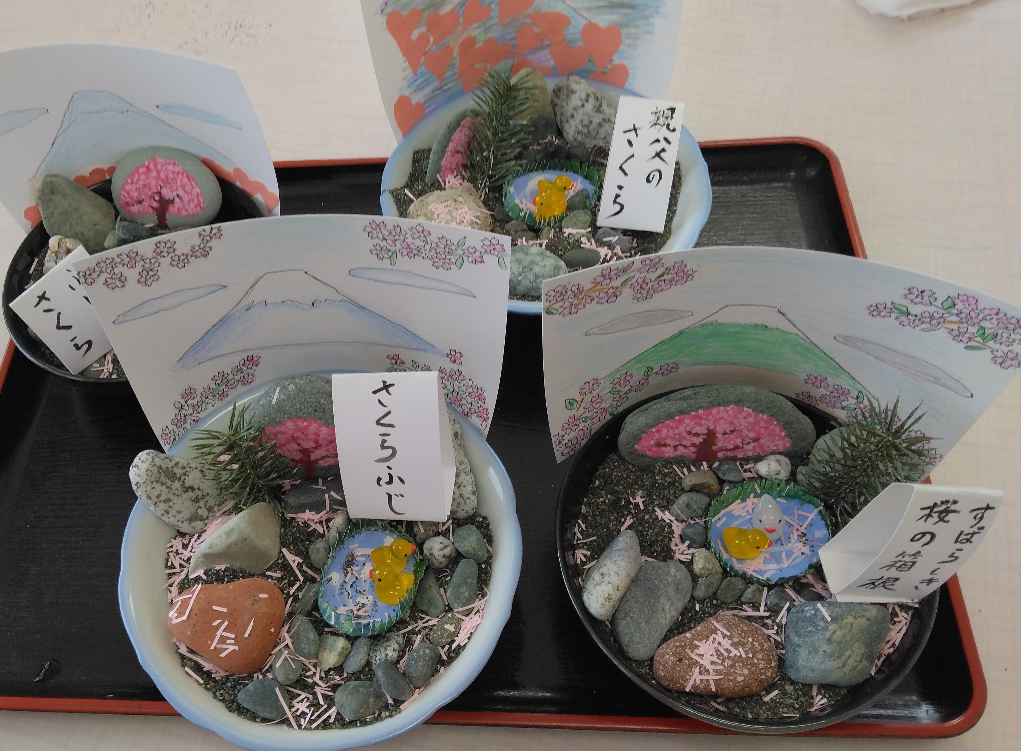 ミニチュア箱庭づくりは秋に1回実施しているので、今回はその時の課題(お客様ができることとできないことへの配慮、時間配分、あらかじめ工作キットを事前準備しておく、サンプル試作によって工作の過程を確認しておく、等々)を改善し、円滑に作業を進めることができました。箱庭の材料のお皿や石、砂は前回の秋のバージョンをリサイクルしました。 歌レクはギター伴奏による合唱です。脳トレを兼ねた〈幸せなら手をたたこう〉、〈いい湯だな〉の替え歌による施設のテーマソング、〈青い山脈〉を皆さんと一緒に合掌しました。〈青い山脈〉ではお客様のハーモニカとのコラボも実現しました。皆さん、「楽しい!」と声に出しておっしゃってくださり、とても楽しんで満足されていた様が感じられて、良かったと思いました。歌レクは参加型で展開した方が満足感が得られます。今後も選曲などをを工夫しながら、継続してゆくつもりです。