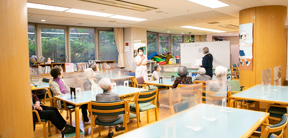 20名ほどのご利用者様の前で昭和歌謡など懐かしの歌を、聴いたり唄ったりしてい頂き、午後のひとときを過ごしてました