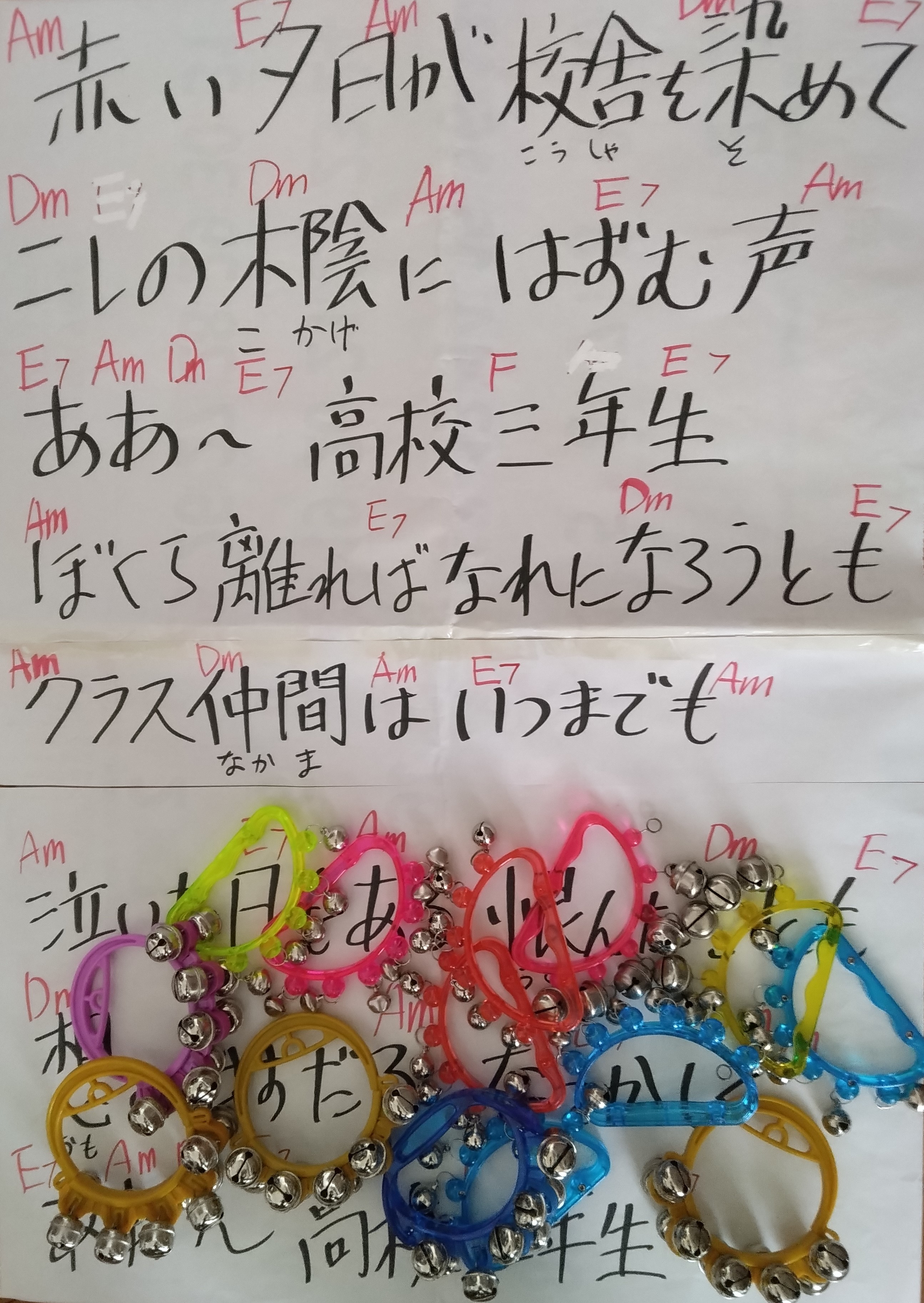 歌レクはギター演奏による合唱です。厚木市のフードバンクがハンドベルの鈴を15個、寄贈してくれたので、お客様とスタッフさんに報告し、早速レクで使用してみました。歌レクは歌詞をホワイトボードに貼り出し、歌手やその時代についておしゃべりを交えながら、みんなで合唱するスタイルです。90歳前後のお客様が多いので、50~60年代の昭和歌謡を選曲しています。ギター歴4か月の初心者ですが、合唱は脳トレや手の運動にもなり、各人が歌が流行した頃の想い出を蘇らせる契機にもつながります。本日の選曲は、1)「高校三年生」、2)「いつでも夢を」、「青い山脈」、4)「いい湯だな」(替え歌)、5)「幸せなら手をたたこう」です。ハンドベルはギター演奏と相まって、一緒に合奏している感覚をもたらし、良い刺激になっているように思われます。