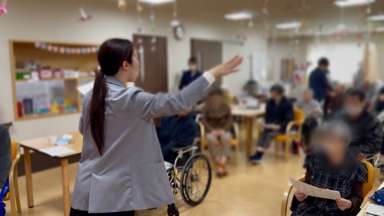 今回は桜の季節に合わせて、和歌「敷島の」を題材に、「みなさんで一緒に一曲吟じてみましょう」というテーマで進めました。 意味にふれながら、声の出し方や呼吸、節回しを、耳で聴いて少しずつ真似していただく形です。 最初は少し控えめだった声も、だんだんと伸びやかになっていき、最後には空間全体がひとつになったような感覚がありました。 その変化がとても嬉しく、“声を出す力”って大きいなと改めて感じました。 昔詩吟をされていた利用者様もいらっしゃったので、皆さまの前でご披露いただいたところ、 「また詩吟ができて嬉しい〜!」ととても喜んでくださり、その笑顔がとても印象に残っています。私まで胸があたたかくなりました。 まだまだ工夫できることも多いと感じているので、耳が遠い方や目が見えにくい方にも、より参加しやすい形を考えながら、次はさらに良い時間にしていきたいです。